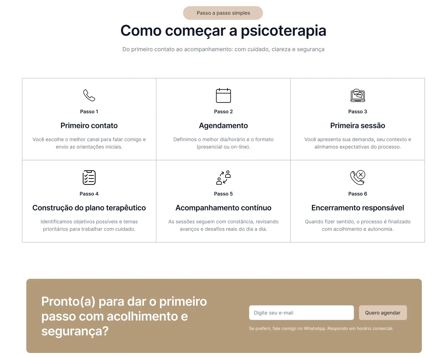 Visual suave, conteúdo claro e CTA direto no WhatsApp, responsivo.